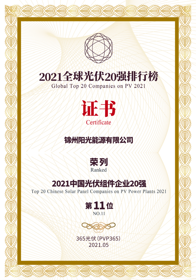 排行榜以上一年度全球光伏行業(yè)各企業(yè)全年光伏相關(guān)項目、產(chǎn)品及服務等營業(yè)收入、全球出貨量、全球并網(wǎng)裝機量等財務數(shù)據(jù)為排名依據(jù)?!坝脭?shù)據(jù)看發(fā)展,以業(yè)績證實力”此次排行榜依托于企業(yè)在光伏領(lǐng)域的不斷探索與耕耘,錦州陽光能源有限公司成功入圍“2021中國光伏組件企業(yè)20強”,位列第十一位!
