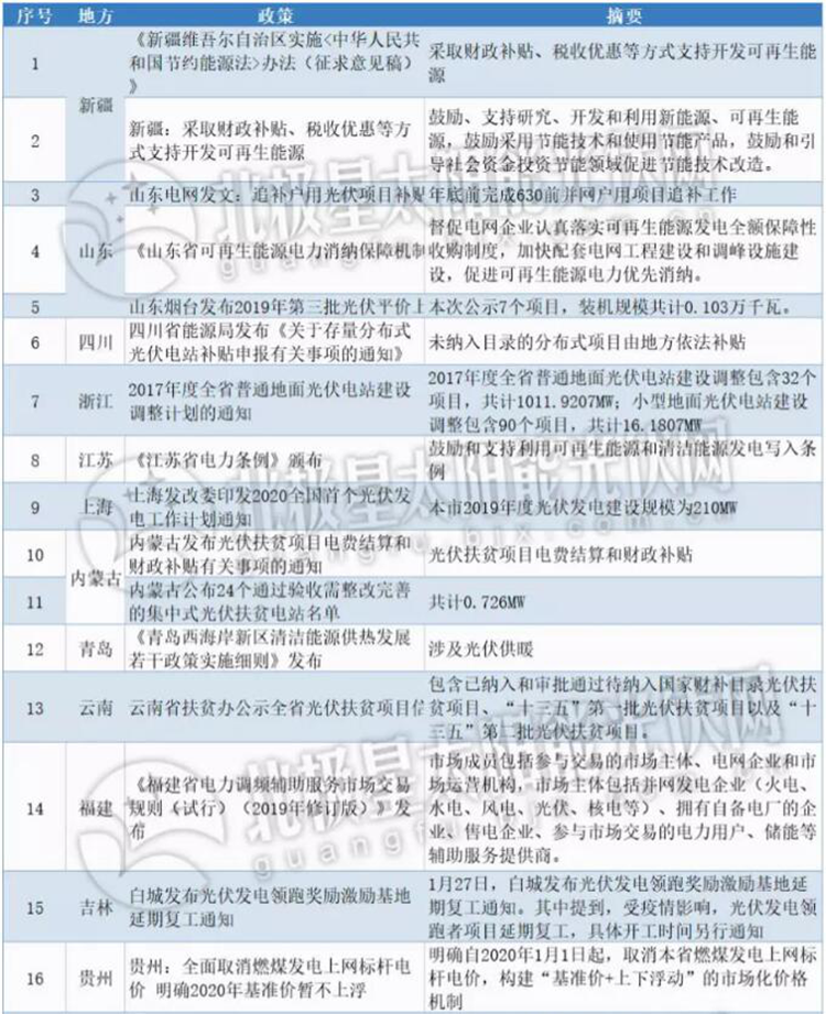 國家層面,從下表發(fā)現(xiàn),國家政策的發(fā)佈時間聚集在月底,當(dāng)大家沉浸在新春氛圍中時,能源局送來新春賀禮——2020年光伏建設(shè)方案出爐,雖然是徵求意見稿,但也明確了幾點內(nèi)容,總補(bǔ)貼額為15億,其中競價專案(地面電站、分佈式)總額為10億,戶用光伏專案為5億;同時,光伏總體消納能力將於3月底揭曉,今年擬新建的補(bǔ)貼競價專案將在4月底開展,可見,國家對光伏的建設(shè)正有條不紊的進(jìn)行。