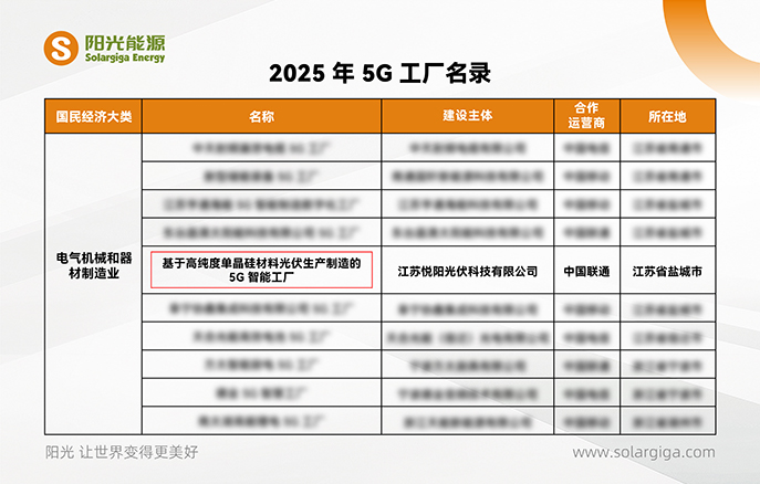 8 月 25 日,工業(yè)和信息化部公示了《2025年 5G 工廠名錄》,陽光能源控股有限公司(以下簡稱“陽光能源”)旗下江蘇悅陽光伏科技有限公司(以下簡稱“悅陽基地”)憑借其在光伏制造領(lǐng)域先進(jìn)的 5G 融合應(yīng)用成果,成功入選這一國家級(jí)名錄。
