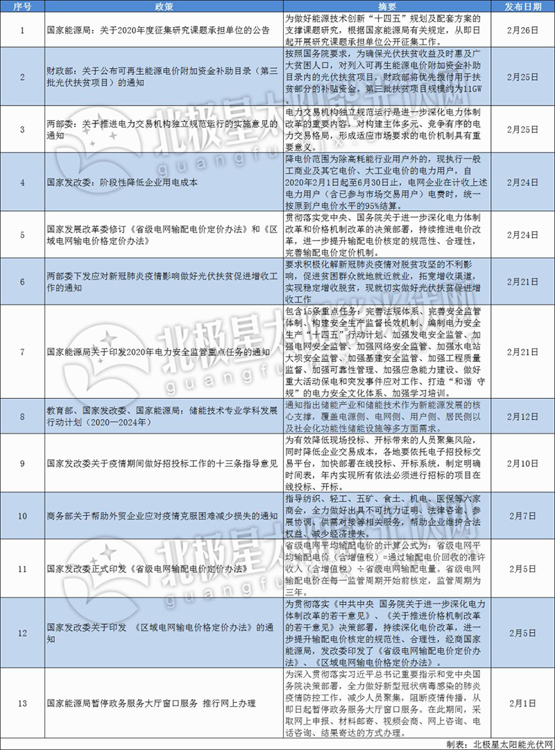 由此,北極星太陽能光伏網(wǎng)梳理了2月光伏政策,其中國家層面共出臺13項(xiàng),涉及光伏扶貧、電力交易、電力安全等;地方層面共21項(xiàng),涉及平價上網(wǎng)、光伏補(bǔ)貼、分佈式光伏、BIPV等多個方面。