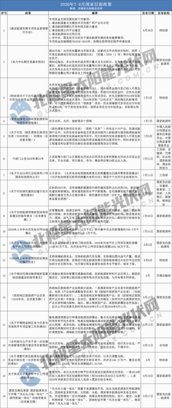 國家層面,7、8月份共發(fā)佈19項(xiàng)光伏政策,涉及可再生能源電價(jià)補(bǔ)貼、光伏競/平價(jià)政策、電力市場交易、BIPV、風(fēng)光儲(chǔ)一體化專案等多個(gè)方面。